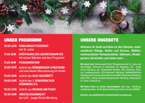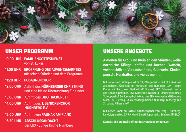 Mit dabei sind: Wohnprojekt OLGA, Pfarrgemeinschaft St. Lukas und Allerheiligen, Ökumene im Nordosten von Nürnberg, LUX – junge Kirche Nürnberg, ejn, Stadtteiltreff Nordost, SPD Ortsverein Nordost, Landbierparadies, SOS-Kinderdorf Nürnberg, Stadtteilbibliothek Schoppershof, Seniorenarbeit Wöhrd des BRK Kreisverband Nürnberg Stadt, ESG – Evang. Studierendengemeinde Nürnberg, Kindergarten St. Lukas, Fi Bassar e.V.